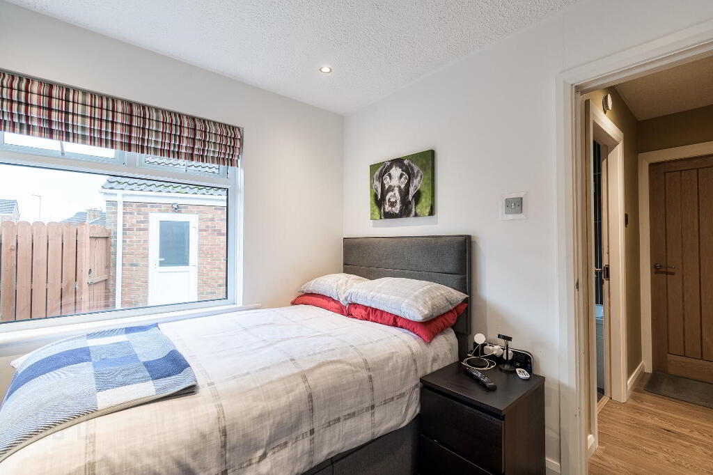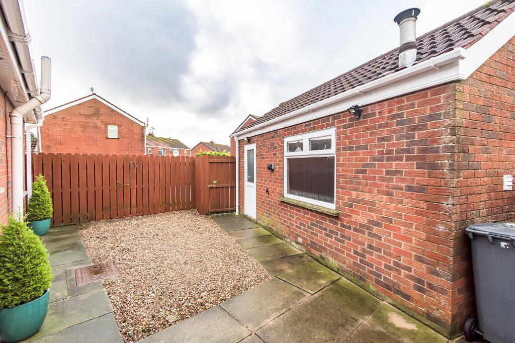 Corner site with neat front and side gardens in lawn. Enclosed rear easily maintained garden paved and in stones. Detached Garage. Tarmac driveway / car parking.