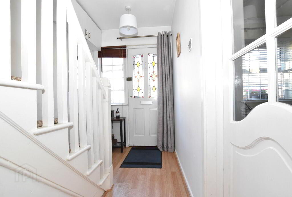 Front door with feature stained glass panel. Spindled staircase to first floor. Understairs storage