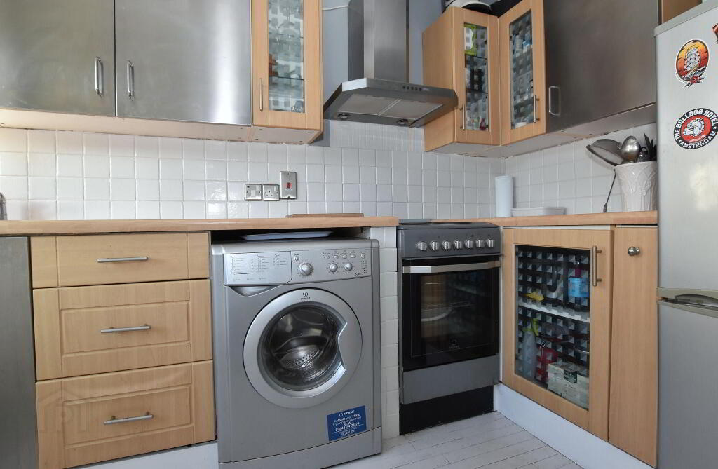 Good range of modern high and low level fitted kitchen units. Stainless steel extractor hood. Space for cooker. Plumbed for an automatic washing machine. Inset sink unit with mixer taps. Part tiled walls. Space for fridge/ freezer. Reclaimed wooden strip flooring. uPVC double glazed exterior door.