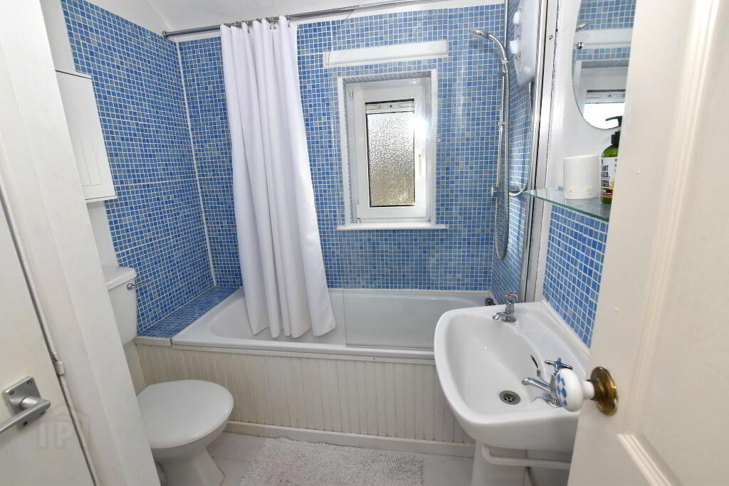 Modern white suite comprising panelled bath, wc with glass shower screen and electric shower over the bath, and wash hand basin and low flush wc. . Partially tiled walls with Mosaic tiles. Built-in hotpress. Wooden laminate. Extractor fan.