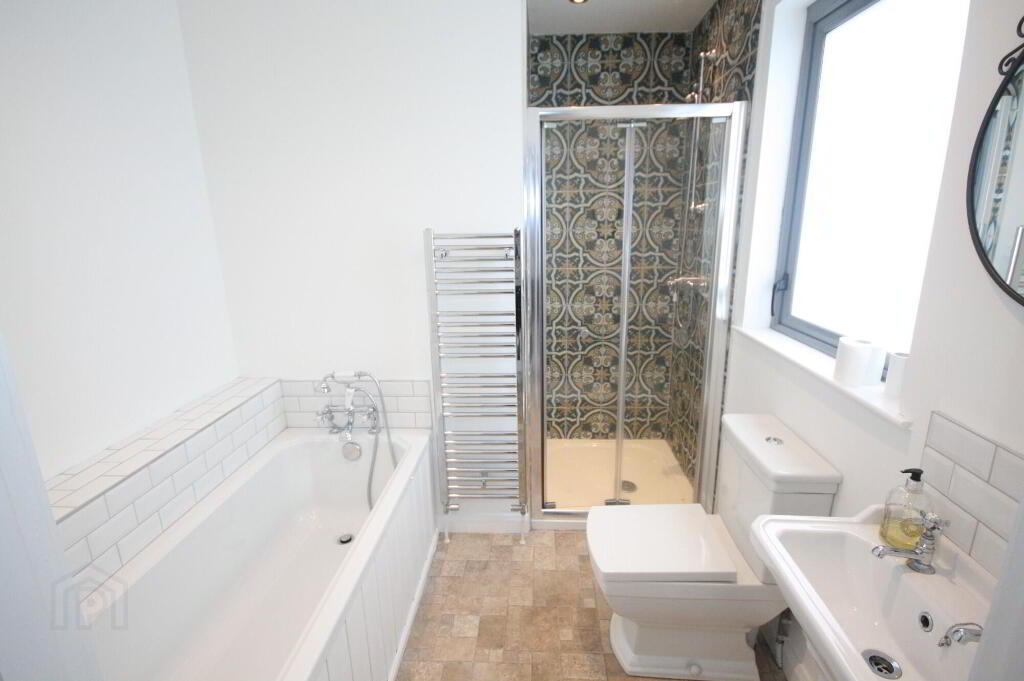 Modern white coloured bathroom suite comprising: panelled bath with chrome mixer tap and shower attachment, tiled splashback over. Low flush wc. Fully tiled shower cubicle. Pedestal wash hand basin. Tiled floor. Low voltage downlights.