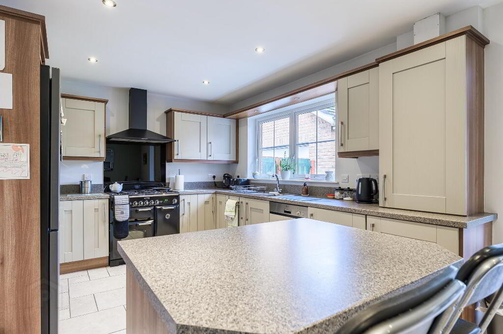 Contemporary pale green coloured fitted kitchen with and excellent range of high and low level units. Extractor hood. Glass splashback. Space for a range style cooker. 11/2 bowl stainless steel sink with mixer taps. Tiled floor. Integrated dishwasher. Integrated washing machine. Space for fridge/ freezer. Centre island/ breakfast bar. Archway to sunroom - Sunroom