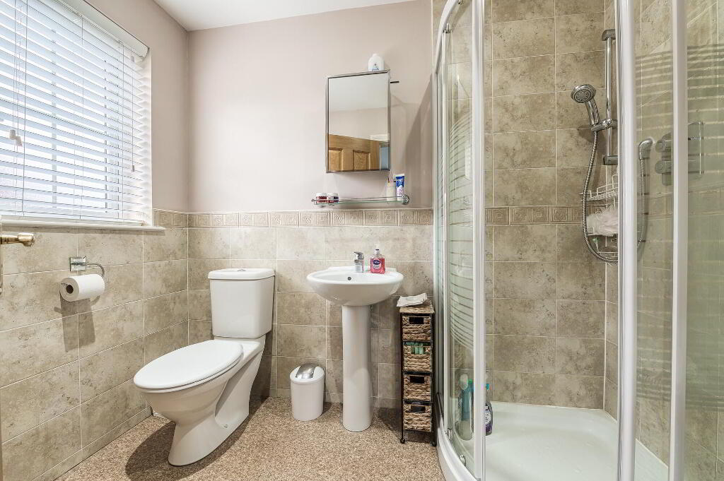 - White coloured sanitaryware comprising; pedeatal wash hand basin, low flush wc and fully tiled shower cubicle. Half tiled walls. Chrome heated towel rail. Low voltage downlights