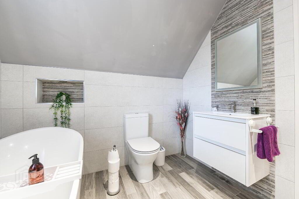 - Beautiful white coloured bathroom suite comprising; a "Slipper bath" with chrome freestanding mixer taps and shower attachment, low flush wc, and vanity unit with inset wash hand basin and tiled splashback over. Chrome heated towel rail. Wooden effect tiled floor.