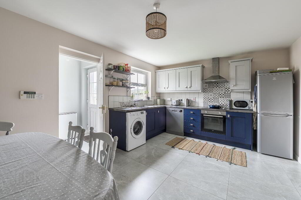 Superb modern fitted kitchen with excellent range of high and low contemporary units. Stainless steel extractor hood. 4 ring ceramic hob. Built in oven.11/2 bowl stainless steel sink unit with mixer tap. Plumbed for automatic washing machine. Plumbed for dishwasher. Space for fridge. Tiled floor. Part tiled walls and splashback. Understairs storage cupboard.