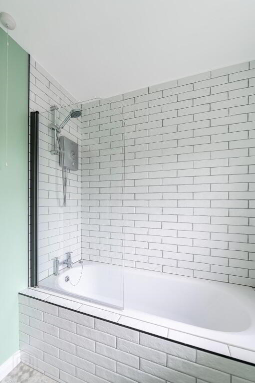 Contemporary white coloured suite comprising; inset bath with chrome mixer tap and shower attachment. Glass shower screen. Feature wall tiling. Pedestal wash hand basin and low flush wc. Tiled floor.