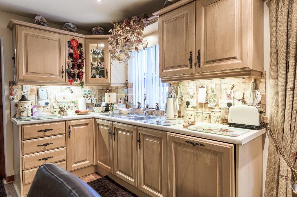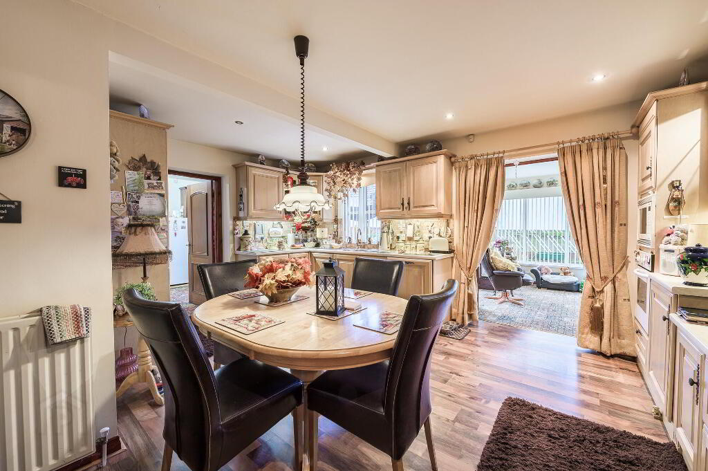 Extensive range of high and low level kitchen units. 1/12 bowl single drainer stainless steel sink unit with mixer tap. Integrated dishwasher. Part tiled walls. Extractor hood, hob, built-in oven. Built in fridge. Double doors to sunroom