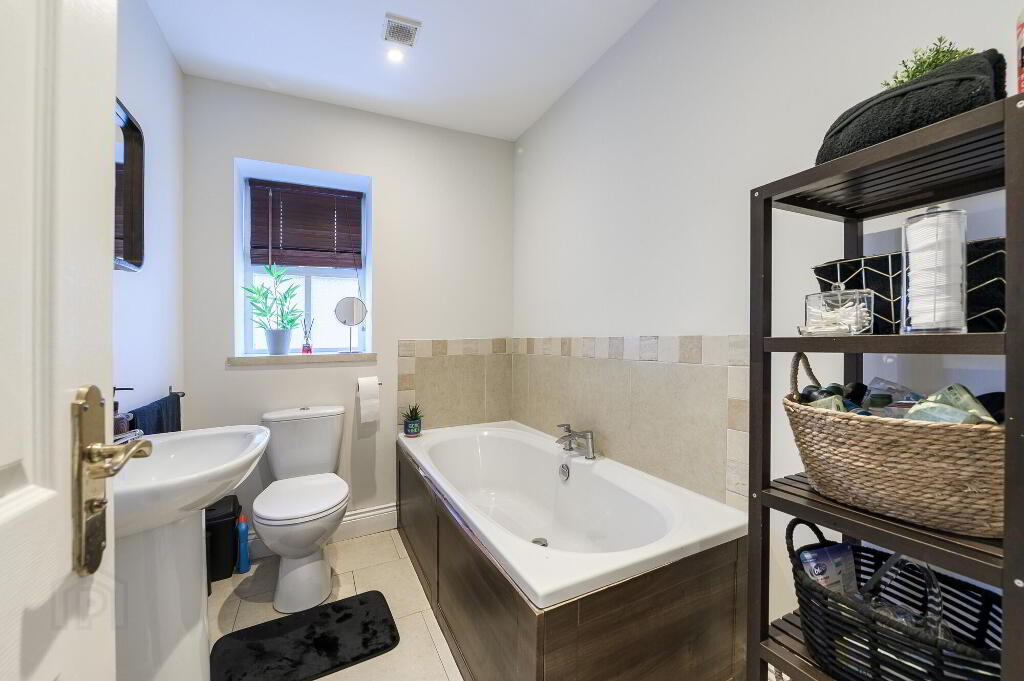 - Modern white coloured suite comprising; panelled bath with central mixer tap and tiled splashback, low flush wc, pedestal wash hand basin with tiled splashback. Tiled floor. Low voltage downlights.