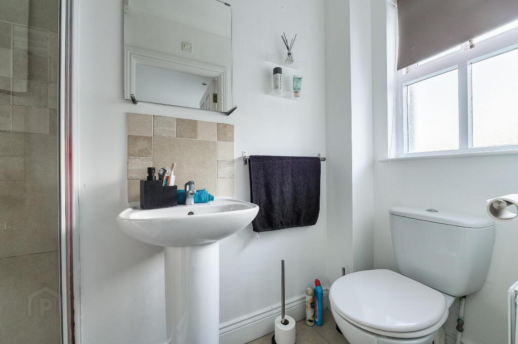 - Modern white coloured suite comprising; low flush wc, pedestal wash hand basin and fully tiled shower cubicle. Tiled floor. Low voltage downlights.