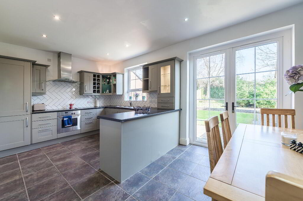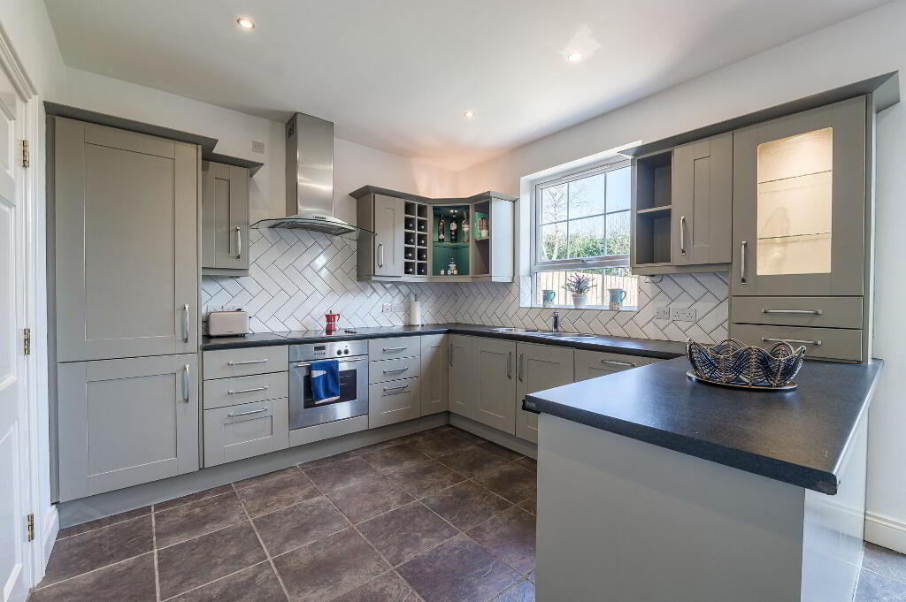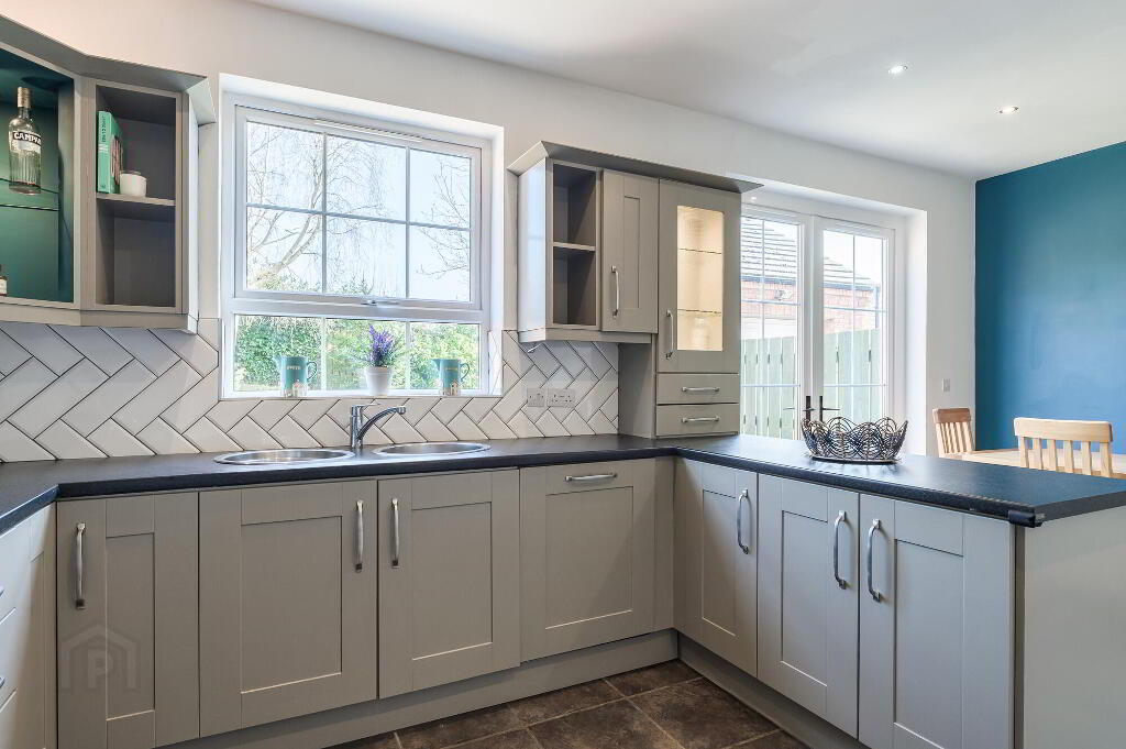 Superb grey painted kitchen with excellent range of high and low level units. Part tiled walls. Stainless steel extractor hood. 4 ring ceramic hob. Built in oven. Inset stainless steel unit with stainless steel drainer and mixer tap. Integrated dishwasher. Integrated fridge freezer. Tiled floor. uPVC double glazed patio doors to garden. - Utility Room