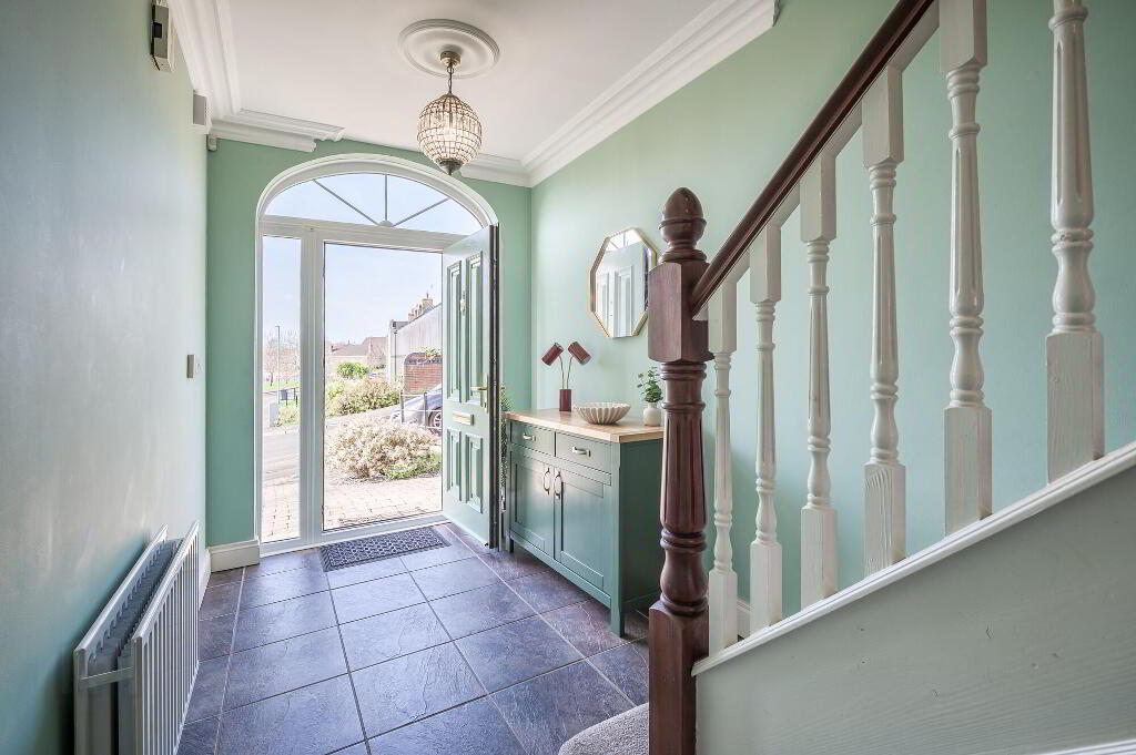 - Composite panelled entrance door with double glazed side panels and fan light. Cornice to ceiling and ceiling rose. Tiled floor. Understairs storage. Spindled staircase to first floor with mahogany newel post.