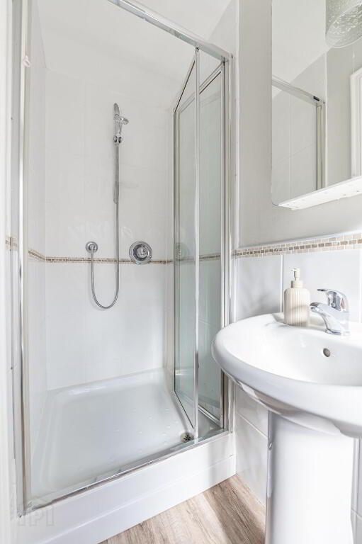 - Modern white coloured site comprising low flush wc, pedestal wash hand basin and fully tiled shower cubicle with folding doors.