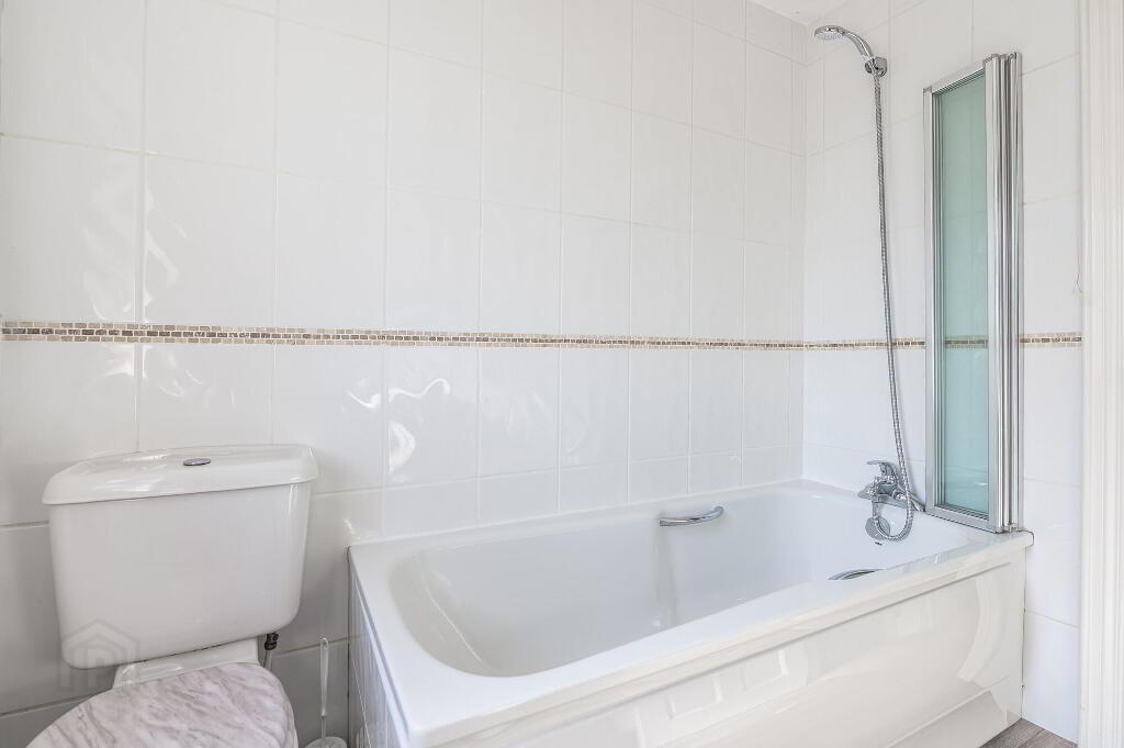 - Modern white coloured suite comprising panel bath with handy grips, shower over bath, folding glass shower screen, low flush wc, pedestal wash hand basin. Part tiled walls.