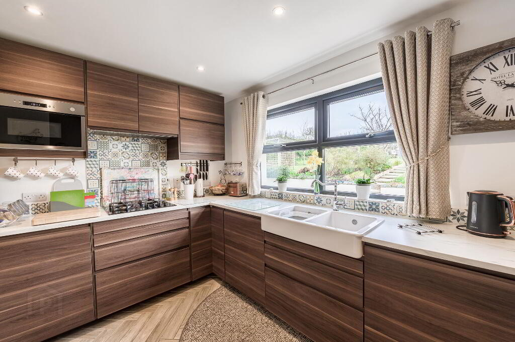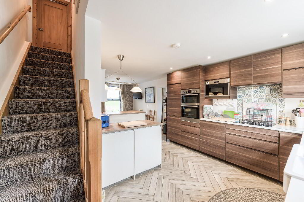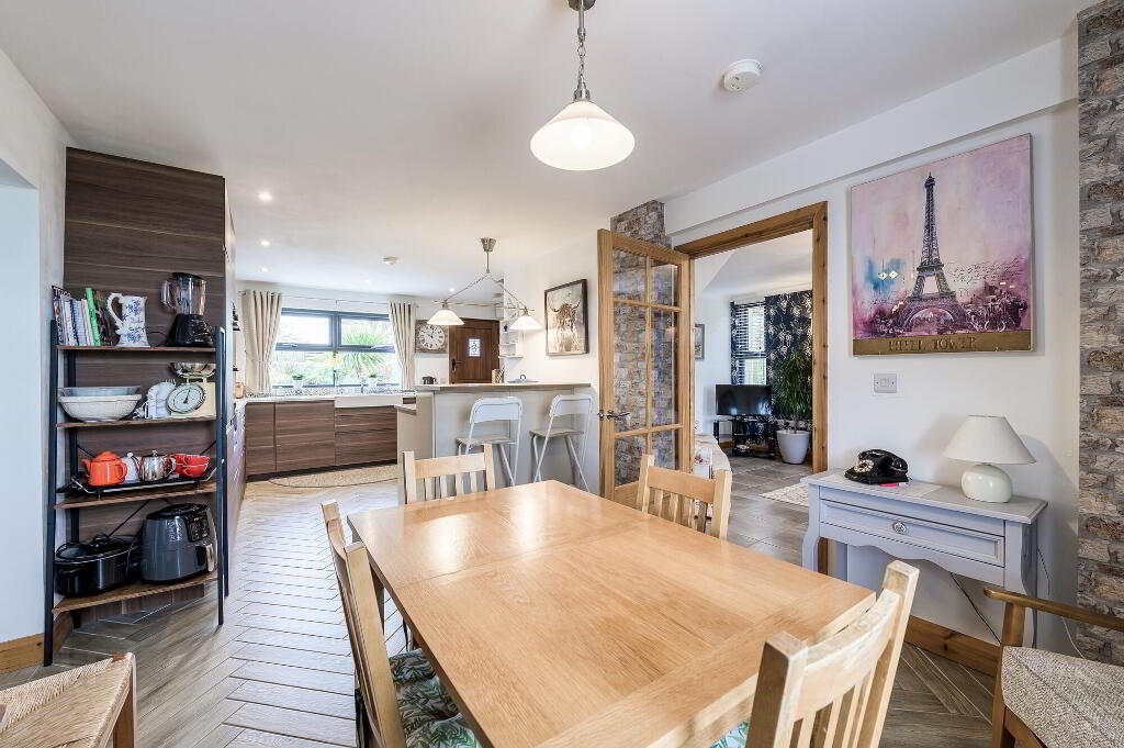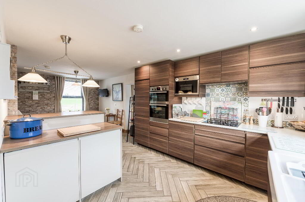 Superb contemporary fitted kitchen with excellent range of high and low level kitchen units, extractor fan, 4 ring gas hob, built in double oven, integrated fridge/freezer, integrated dishwasher. Inset twin bowl ceramic sink unit with chrome mixer tap. Part tiled walls, breakfast bar, beautiful wood effect tiled floor laid in a Herringbone design. Low voltage downlights. Hardwood stable style half in half exterior door. Spindled staircase to first floor (Measurements to max points).