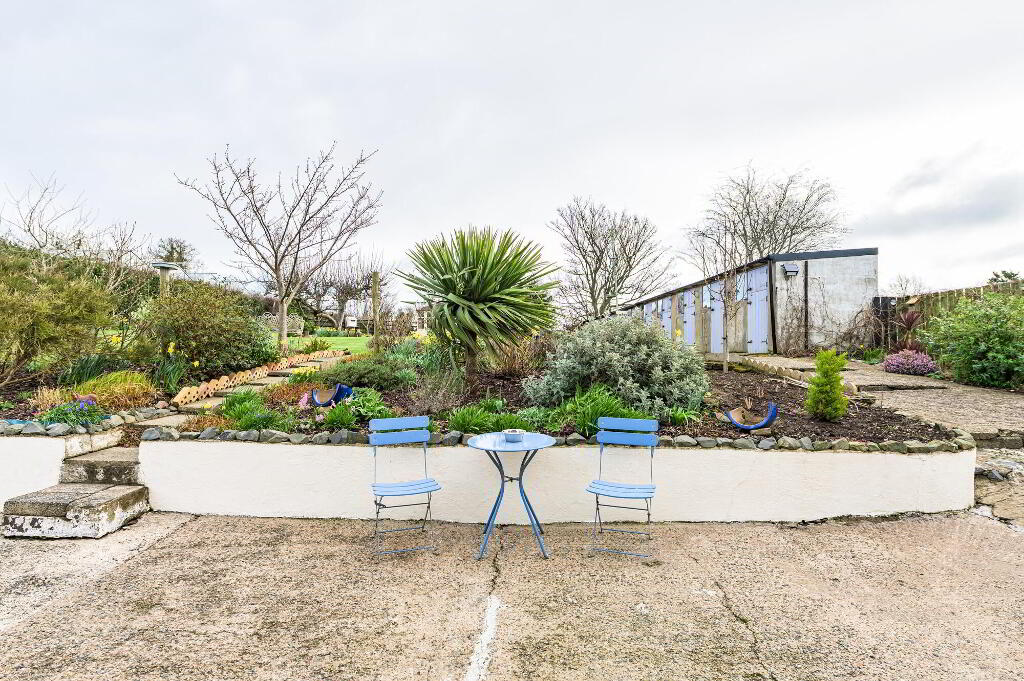 Steps up to a beautiful large garden which has been lovingly tended. Garden is in lawn with an array of colour to the flowerbeds and borders. Summer house to the back of the garden positioned to catch the evening sunshine.
