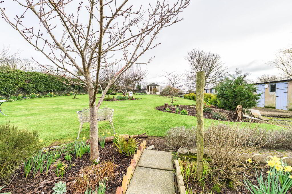 Wooden double entrance gates from Inn Road. Pink gravel driveway/ car parking to front and side. Feature Victorian lamppost style light to garden. Beautiful borders in colourful flowers and shrubs. Lovely views to front looking over fields.