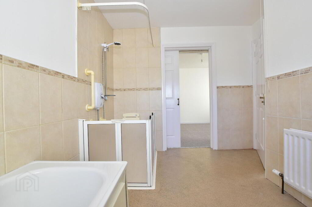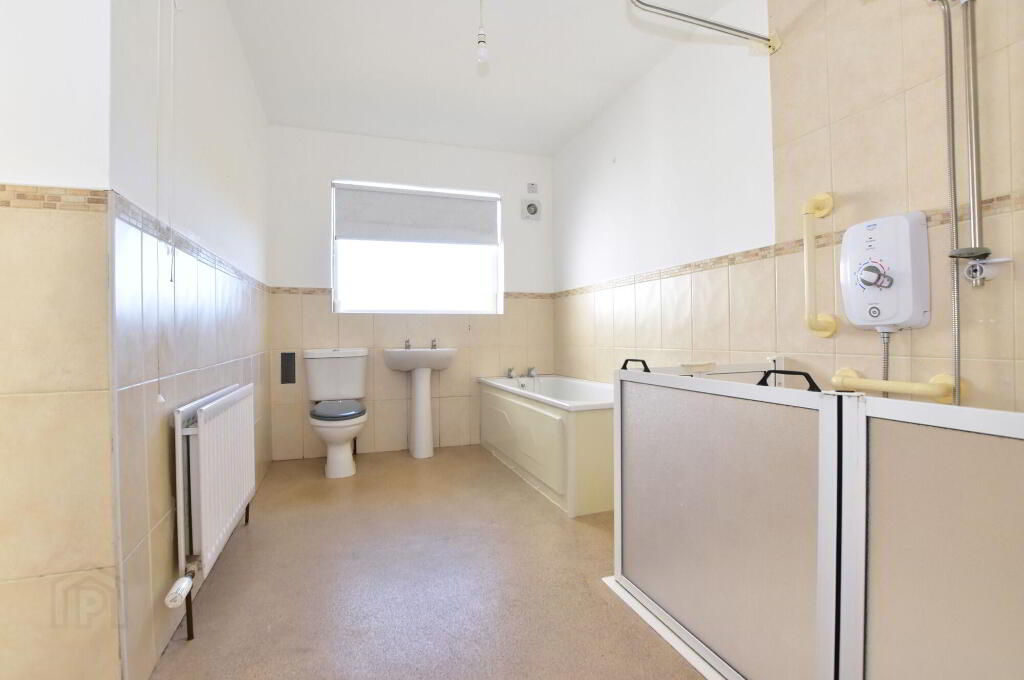 White coloured sanitaryware comprising; low flush wc, pedestal wash hand basin, panelled bath and shower cubicle with half height glass shower screen (suitable for disabled persons). Part tiled walls.