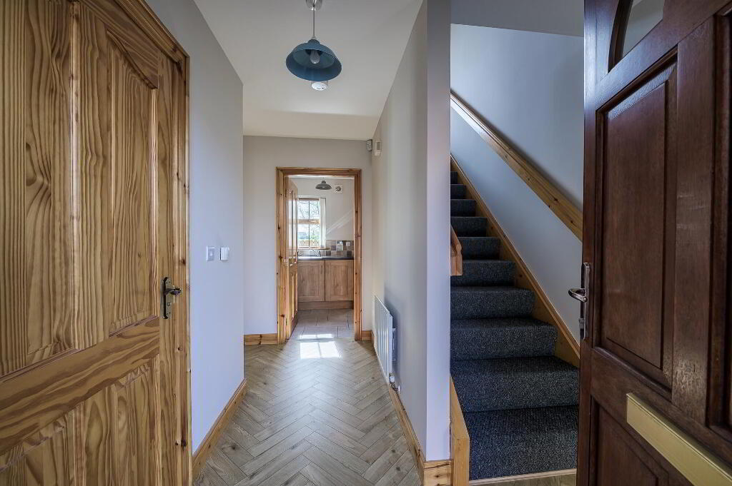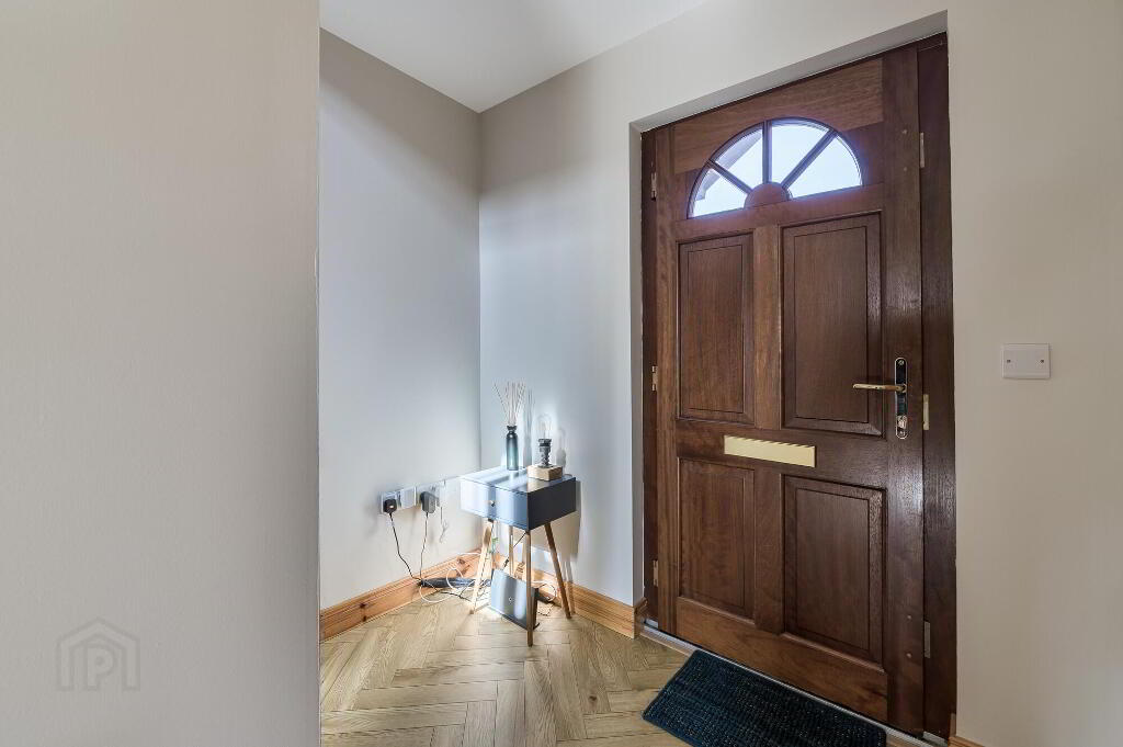 Hardwood entrance door with glazed panels. Wooden laminate flooring. Staircase to first floor.
