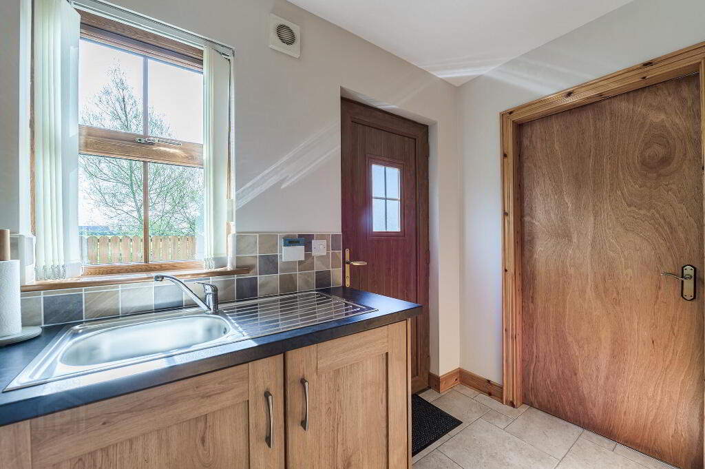 Excellent range of high and low level kitchen units. Stainless steel sink unit with mixer tap. Plumbed for automatic washing machine. Space for tumble dryer. Tiled floor. Built in cloaks cupboard. uPVC double glazed exterior door. Part tiled walls.