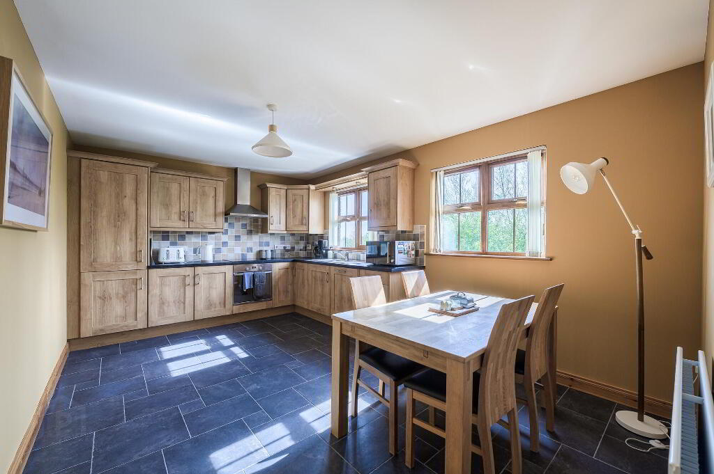 Excellent range of modern fitted high and low level units. Stainless steel extractor hood. 4 ring ceramic hob. Built in under oven. Integrated fridge freezer. Integrated dishwasher. Part tiled walls. Tiled floor.
