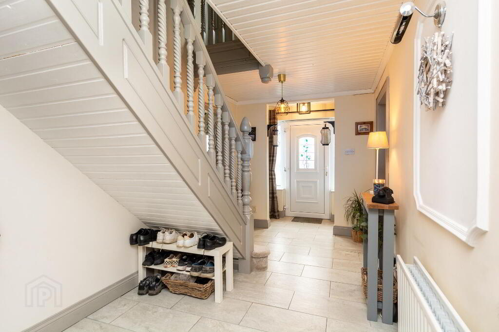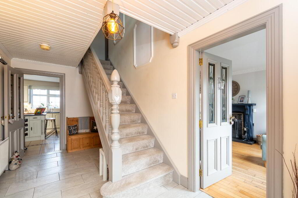 - uPVC double glazed entrance door with double glazed side panels. Tiled floor. Feature spindled staircase to first floor. Understairs storage.