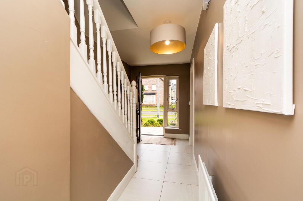 uPVC double glazed entrance door with double glazed side panels. Tiled floor. Spindled staircase to first floor