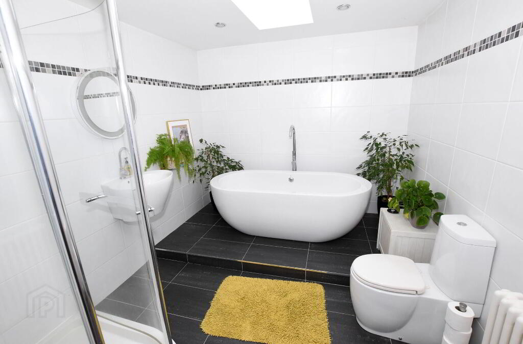 Contemporary suite comprising: freestanding bath with mixer tap, low flush w.c., semi pedestal wash hand basin, large glass shower enclosure, fully tiled walls, low voltage downlights, skylight window, tiled floor, antique style radiator.